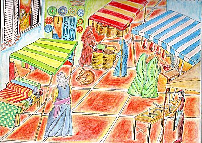 Ahora Azerbaijan y Mahomet tomaron por un polvoriento camino torcido entre palmeras. A lo largo de cobertizos de bambú se veían hileras de viejas lavando azafrán; más allá, junto a un muro gris de piedras y de adobes, tres ancianos de turbante trabajaban frente a un telar. Una malaya hacía girar su rueda. Los hombres levantaron la vista cuando los dos mahometanos pasaron, y la mujer murmuró un conjuro para protegerse del mal de ojo.