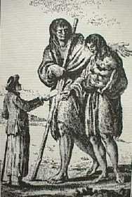 En día en que menos lo esperábamos se nos presentó un hombre de estatura gigantesca. Estaba en la playa casi desnudo, cantando y danzando al mismo tiempo y echándose arena sobre la cabeza. El comandante envió a tierra a uno de los marineros con orden de que hiciese las mismas demostraciones en señal de amistad y de paz: lo que fue tan bien comprendido que el gigante se dejó tranquilamente conducir a una pequeña isla a que había abordado el comandante. Yo también con varios otros me hallaba allí. Al vernos, manifestó mucha admiración, y levantando un dedo hacia lo alto, quería sin duda significarnos que pensaba que habíamos descendido del cielo. Este hombre era tan alto que con la cabeza apenas le llegábamos a la cintura. Era bien formado, con el rostro ancho y teñido de rojo, con los ojos circulados de amarillo, y con dos manchas en forma de corazón en las mejillas. Sus cabellos, que eran escasos, parecían blanqueados con algún polvo. Su vestido, o mejor, su capa, era de pieles cosidas entre sí, de un animal que abunda en el país, según tuvimos ocasión de verlo después. Este animal tiene la cabeza y las orejas de mula, el cuerpo de camello, las piernas de ciervo y la cola de caballo, cuyo relincho imita. Este hombre tenía también una especie de calzado hecho de la misma piel. Llevaba en la mano izquierda un arco corto y macizo, cuya cuerda, un poco más gruesa que la de un laúd, había sido fabricada de una tripa del mismo animal; y en la otra mano, flechas de caña, cortas, en uno de cuyos extremos tenían plumas, como las que nosotros usamos, y en el otro, en lugar de hierro, la punta de una piedra de chispa, matizada de blanco y negro. De la misma especie de pedernal fabrican utensilios cortantes para trabajar la madera. |